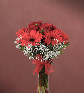Vazoda Kırmızı Gerberalar ve Kırmızı Güller 5 adet kırmızı gül.